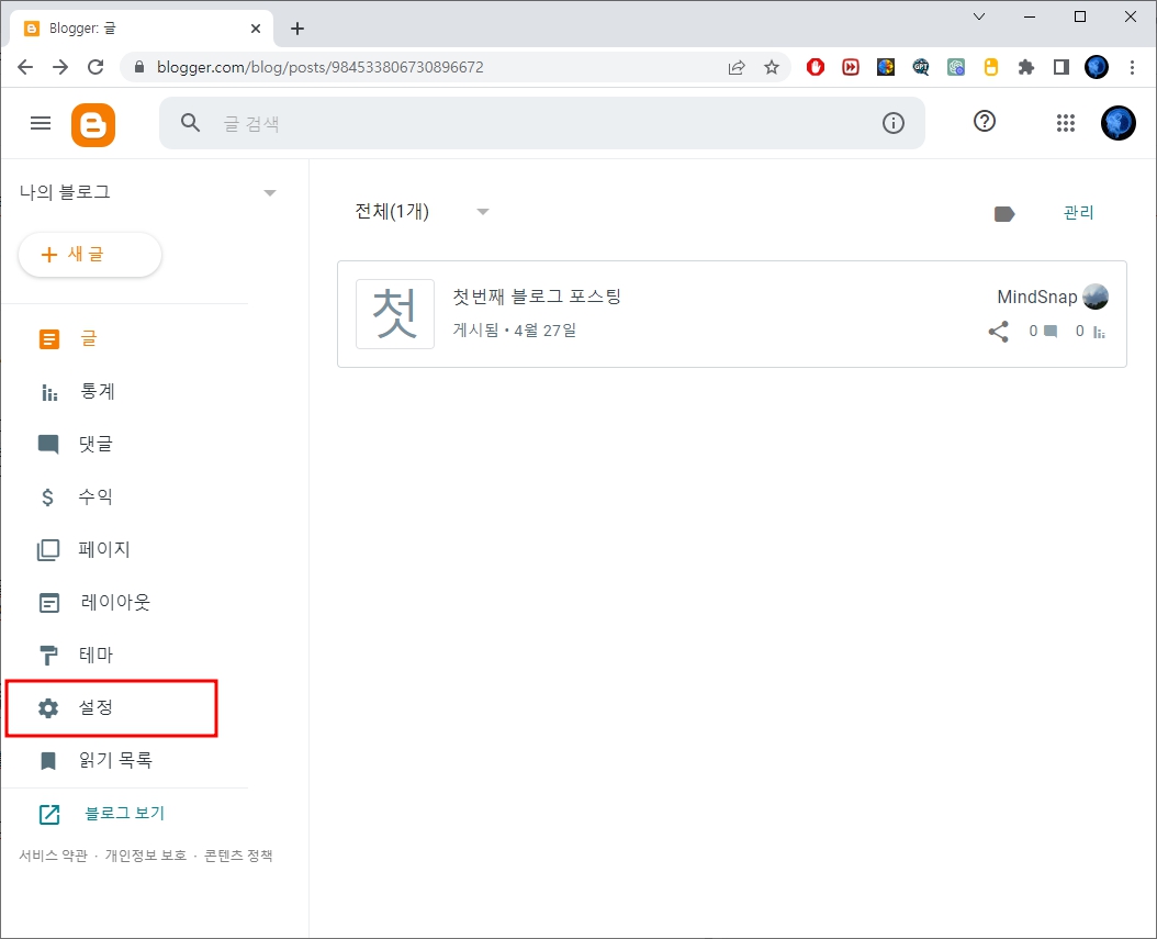 - 블로그스팟 메인 화면에서 시작하도록 하겠습니다. 아래 화면에서 빨간색 박스 부분의 설정을 클릭합니다.